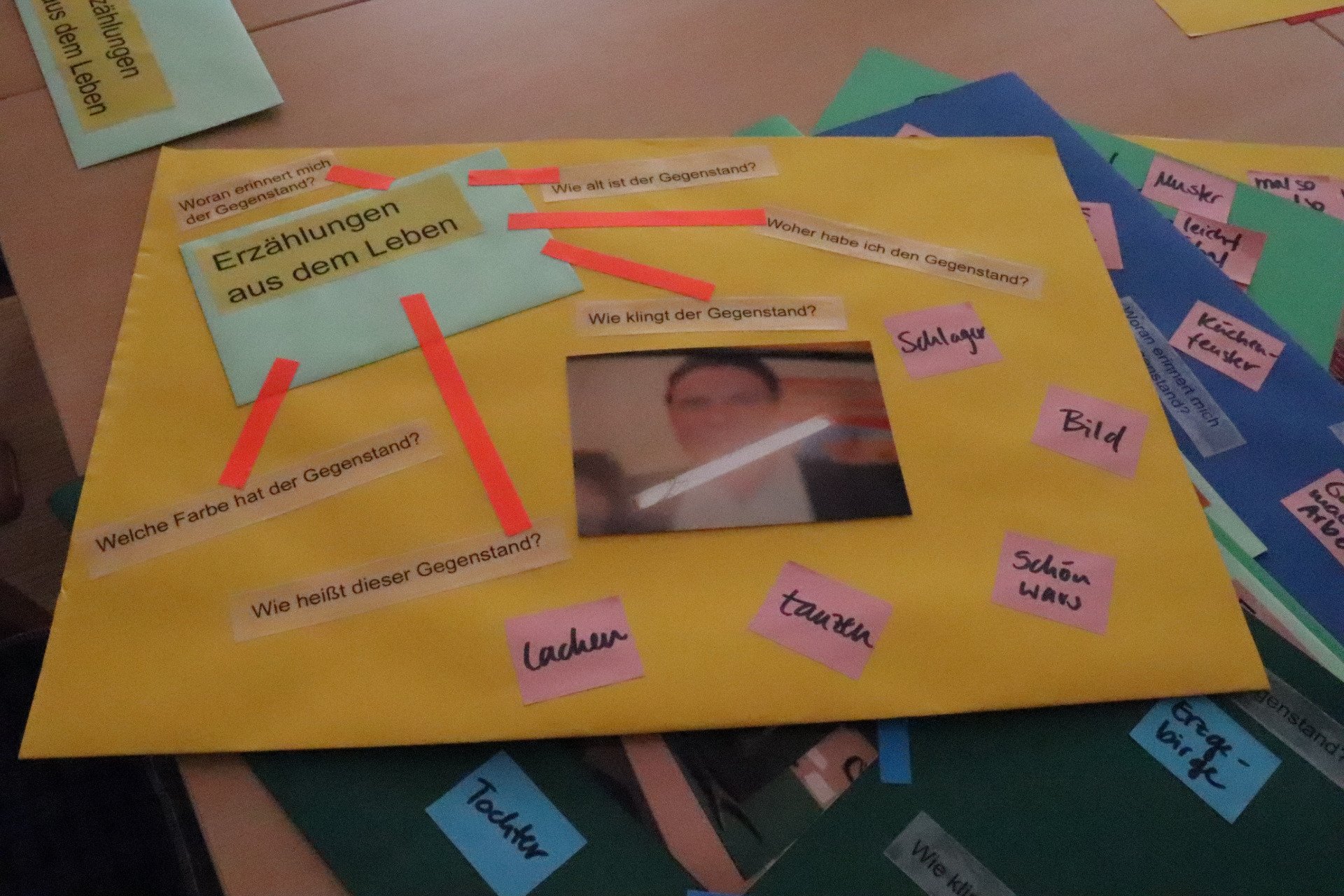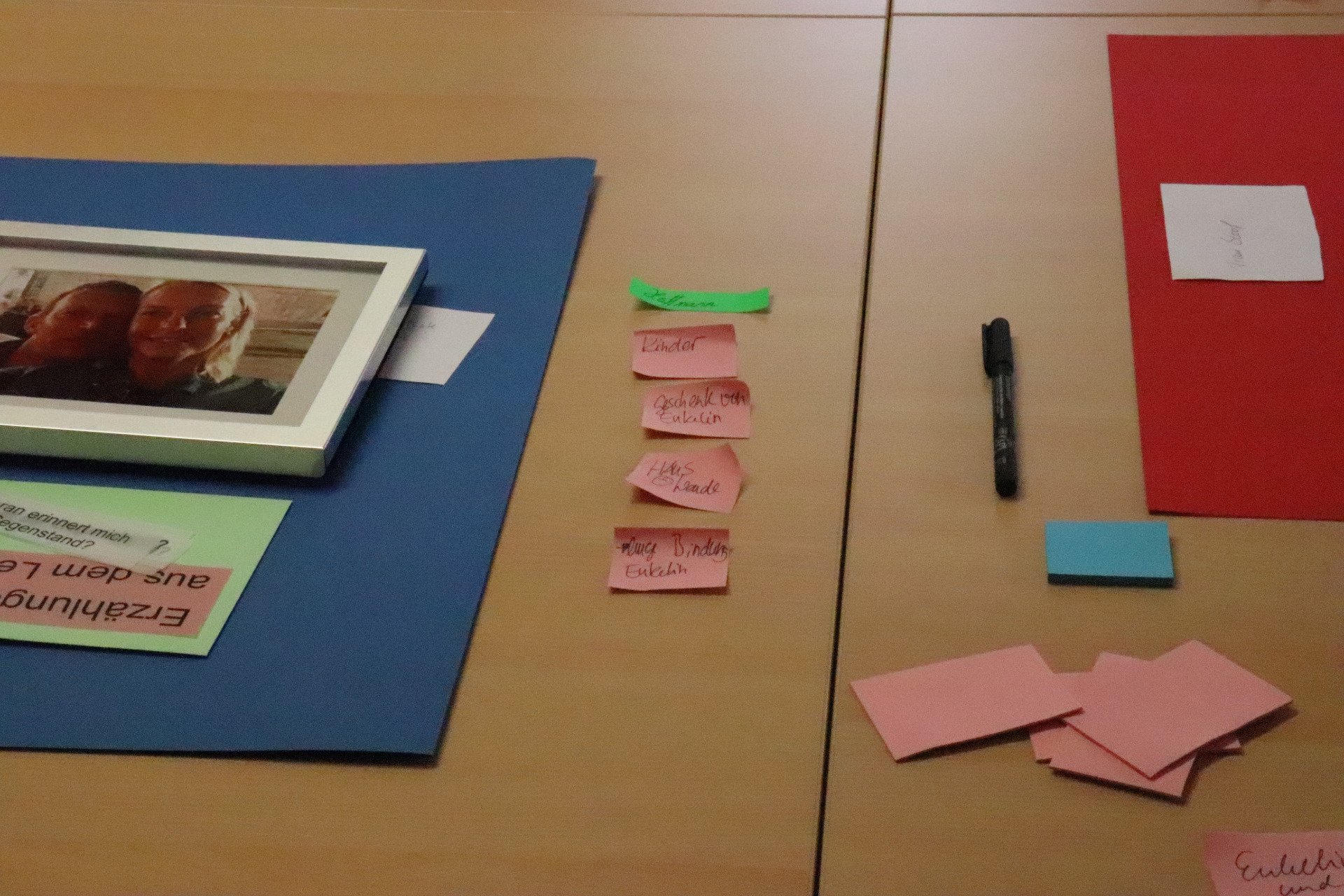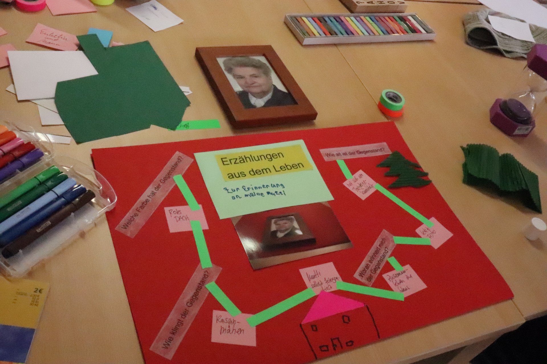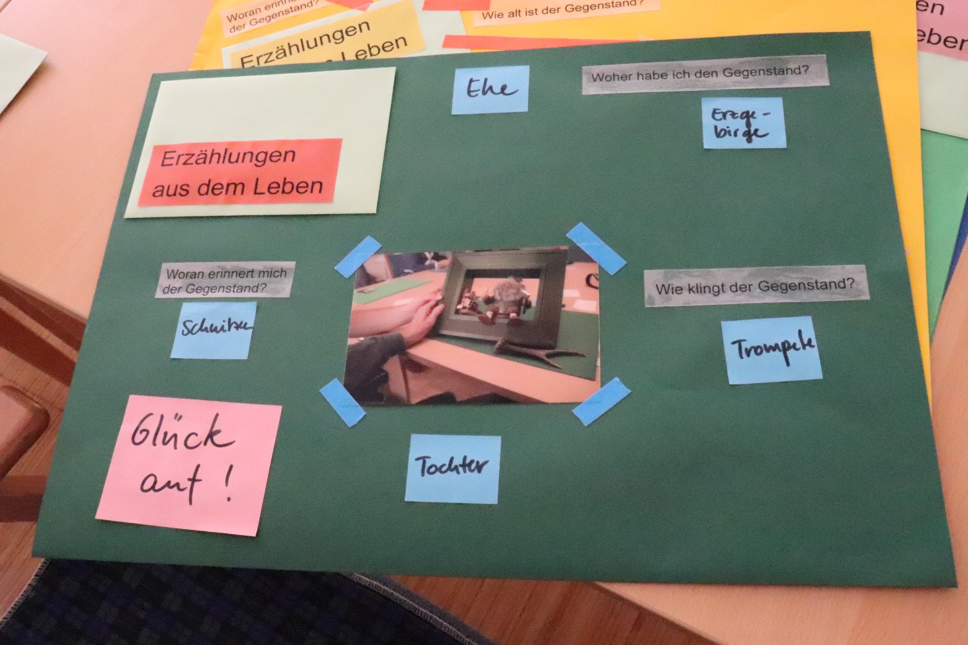 Jeder der Teilnehmer bekam einen Umschlag mit Fragen, die er zu dem Gegenstand beantworten sollte. Die Antworten wurden dann von Frau Gutschow als Notizen auf PostIts geschrieben und dann gemeinsam mit den Senioren auf den Steckbrief geklebt. Dabei durften die Teilnehmer bestimmen, welche Antworten zu welchen Fragen gehörten und wo diese hin geklebt werden.