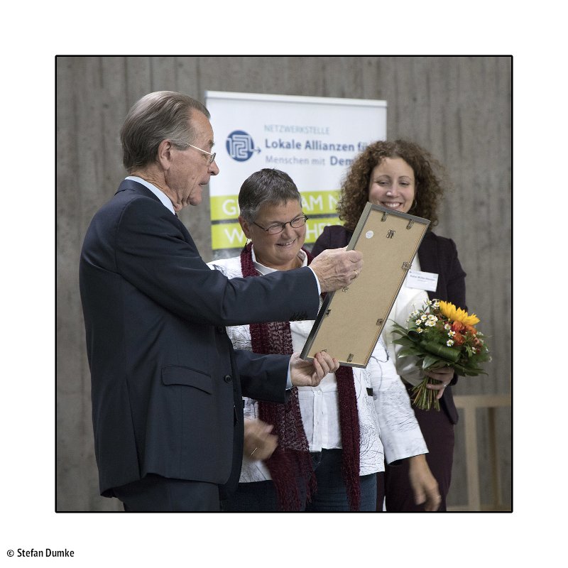 Der GERAS-Preis wurde vom BAGSO-Vorsitzenden Franz Müntefering in Duisburg überreicht. „Mit Angeboten im Bereich Kunst und Kultur können verloren geglaubte Fähigkeiten älterer Menschen wieder hervorgeholt werden“, sagte Müntefering. „Die Menge an eingereichten Initiativen – insgesamt waren mehr als 120 – spiegeln die nahezu grenzenlosen Möglichkeiten wieder.“ Die Preisverleihung fand im Rahmen der Fachtagung „Beteiligtsein von Menschen mit Demenz – Kunst und Kultur schaffen Zugänge“ der Netzwerkstelle „Lokale Allianzen für Menschen mit Demenz“ der BAGSO statt.