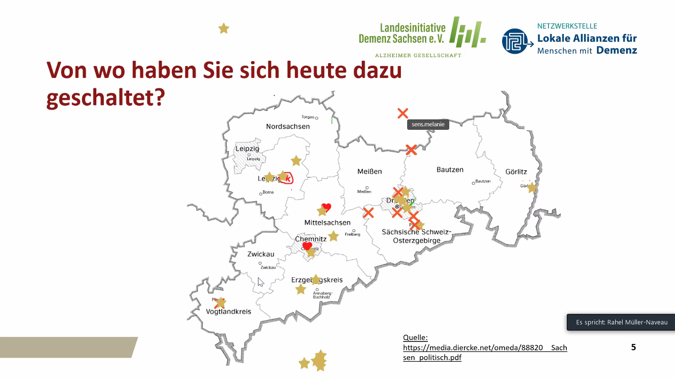 Nach einer digitalen Verortung im Bundesland und einem „Speed-Dating“, bei dem sich die Teilnehmer*innen mit einer zweiten Person in einem separaten Raum vorstellen und kennenlernen konnten, startete der erste Themenblock. Die Landesinitiative Demenz stellte den Landesverband und das Projekt "KOOP Demenz Sachsen“ vor. Es wurden zahlreiche Möglichkeiten zur Unterstützung und Angebote der Landesinitiative aufgezeigt: unter anderem die Nutzung des digitalen Tools „Ecosero“, das Selbsthilfe- und Arbeitsgruppen für virtuelle Treffen nutzen können, Möglichkeiten der Website, verschiedene Broschüren und eine umfangreiche Film- und Videosammlung; Veranstaltungs- und Schulungsangebote, Unterstützungsmöglichkeiten für Selbsthilfe- und Angehörigengruppen, Projekte zur kulturellen Teilhabe und Urlaubs- und Erholungsangebote.